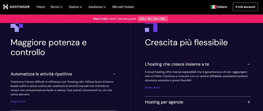 Hostinger: primeggia nella fascia business grazie a dischi NVMe, CDN gratuita, backup giornalieri e una configurazione modulare. Gli sconti fino al 75% facilitano la migrazione da soluzioni più lente. Da tenere con to che NON ha datacenter in Italia e questo influenza la velocità.