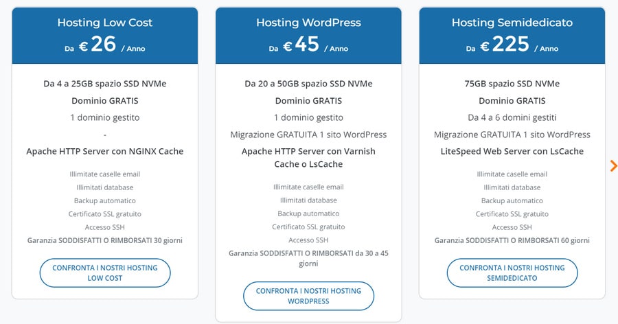 WP02: 35GB SSD, 2.5 vCPU, 3GB RAM a €60/anno—spazio ampliato e risorse superiori, pensato per progetti che stanno decollando. WP03: 45GB SSD, 2.5 vCPU, 3GB RAM a €69/anno—per siti più complessi e destinati a ricevere traffico regolare.
